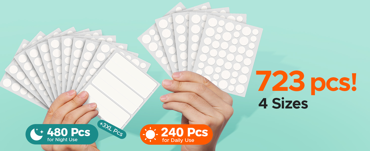- Bulk 723 Counts Pimple Patches: 240 AM acne patches for face, 480PM blemish patches and 3 XL hydrocolloid bandages. Choose the desired zit patches and stick it on the affected area